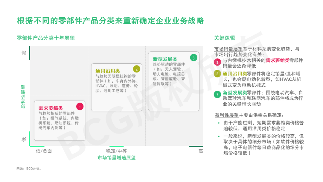 我们认为,中国零部件企业需要以前瞻性的眼光重新审视产品组合,根据与颠覆性行业趋势的匹配程度,界定不同的零部件产品分类,重新确定企业业务战略。BCG基于对市场销量增速和产品盈利性的展望,结合材料采购趋势和市场出行趋势的变化,将汽车零部件分为需求萎缩类、通用沿用类和新型发展类。我们认为与内燃机技术相关的需求萎缩类零部件的销量会逐渐降低;通用沿用类零部件的销量将稳定/温和增长,自身也会朝电动化转型,如HVAC从机械式变为电动机械式;而电动汽车、自动驾驶汽车和联网汽车相关的新型发展类零部件将成为行业的关键增长驱动力。