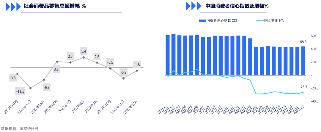 从国家统计局宏观数据表现来看,受疫情大面积反复影响,消费市场明显承压,3月、5月、10月、11月社会消费品零售额同比负增长。从2022年1-12月整体来看,社会消费品零售总额同比下降0.2%。随着疫情管控政策逐步放开,在短期冲击之后,12月零售总额同比下降1.8%,降幅相比11月明显收窄。同时,12月中国消费者信心指数为88.3,比11月的85.5略有回升。综合来看,整体消费市场呈止跌、蓄势回暖趋势。