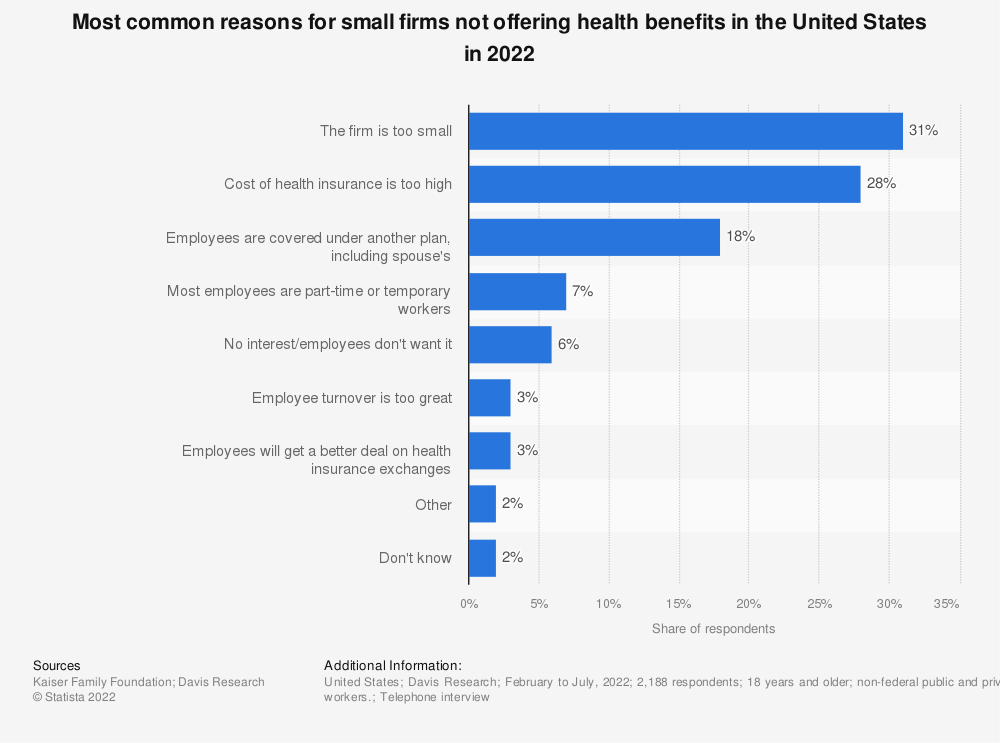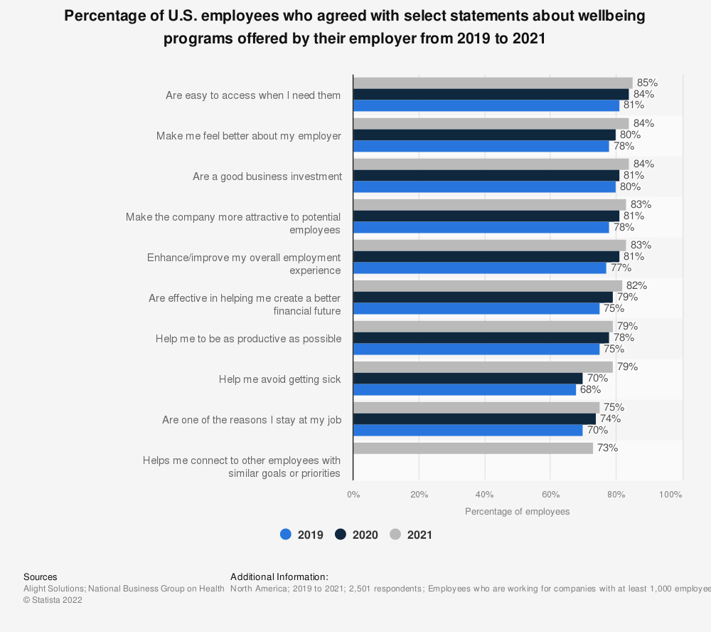 导致工作压力的主要因素包括工作量、对工作保障的担忧以及无法平衡工作和个人义务。2022年对美国雇员的一项调查发现,约23%的人表示他们自我评估的职业倦怠程度非常高或高,而只有41%的人表示他们的自我评估倦怠水平很低或很低。这些信息激励了更多的雇主为员工提供福利和健康计划,以减轻压力。在2021年,员工高度重视的健康项目包括现场健康中心、个性化健康管理、睡眠改善项目或资源,以及与心理健康专业人员进行电话/虚拟/在线访问。较大的公司更有可能为员工提供此类福利,约四分之一的小公司表示,医疗保险的成本太高,他们无法为员工提供健康福利。