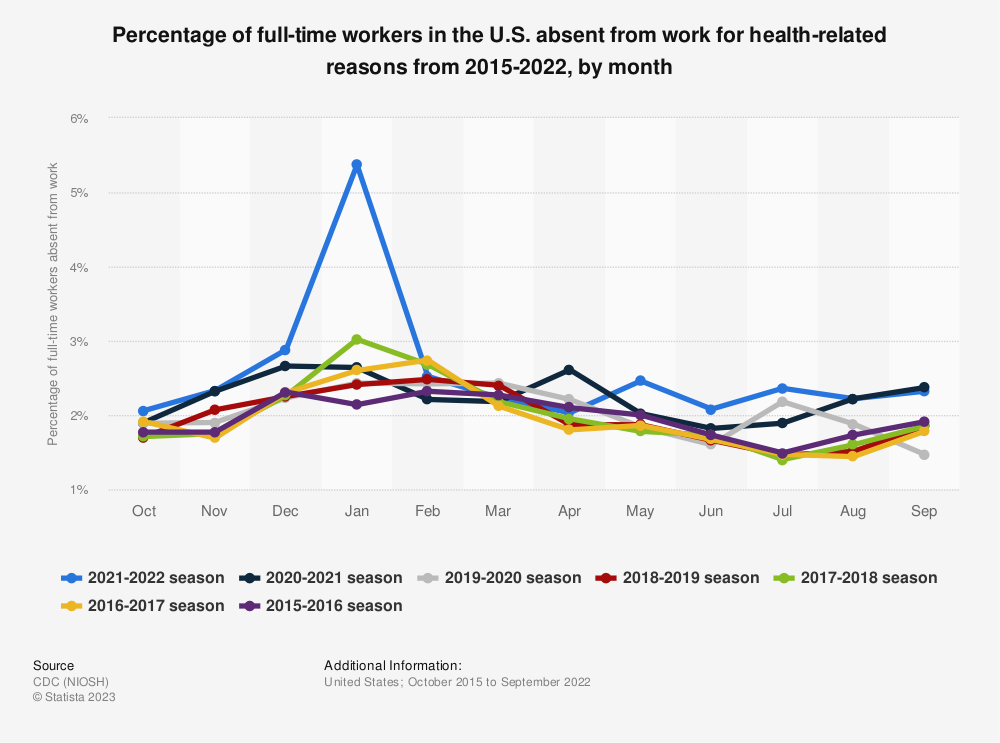 2015-2022年美国全职员工因健康原因缺勤的百分比,按月计算 数据来源:Statista.com