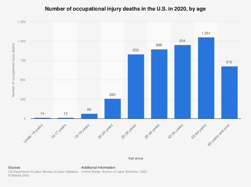 不出所料,与工作有关的身体伤害死亡最常发生在涉及重型机械和需要剧烈体力活动的职业,如伐木、捕鱼和钢铁结构工作。2020年,美国约有4764人死于工伤,其中55岁至64岁的人占比最大。2020年,非致命性工伤的发生涉及到离开工作岗位的天数,最常见于营养师、焊接、焊锡和钎焊机安装人员、操作员和招标者,以及运动员和体育竞技者。