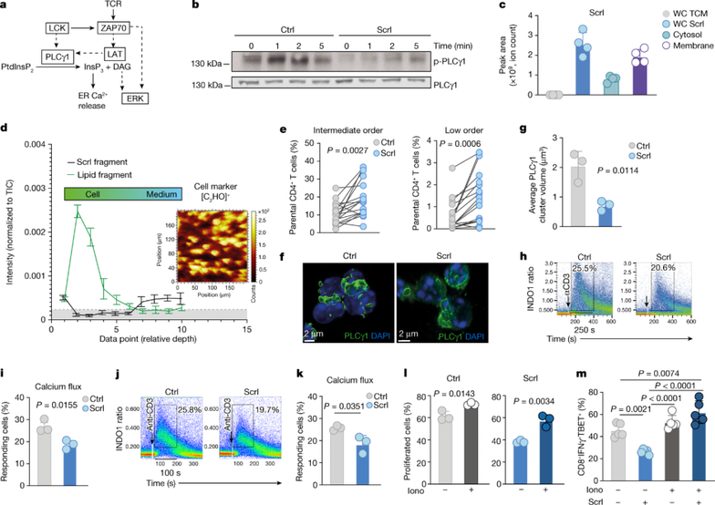 研究人员使用质谱成像平台 cryo-OrbiSIMS,检测了活化 T 细胞中三氯蔗糖的空间分布。他们发现三氯蔗糖可以影响T 细胞的膜流动性和有序性从而降低PLCγ1在膜上的聚类和与 TCRβ 的共定位。而PLCγ1 聚类已被证明是T细胞信号转导所必需的。