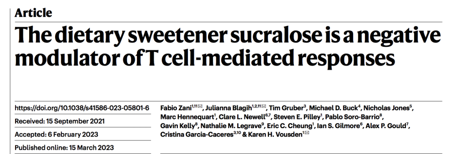 【1】Zani, F., Blagih, J., Gruber, T. et al. The dietary sweetener sucralose is a negative modulator of T cell-mediated responses. Nature (2023). https://doi.org/10.1038/s41586-023-05801-6
