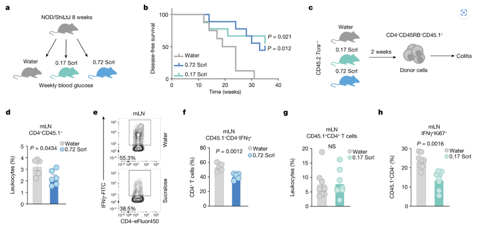 考虑到三氯蔗糖对 T 细胞反应的抑制,研究人员进一步探索三氯蔗糖是否抑制 T 细胞介导的自身免疫来获得治疗价值。1型糖尿病(T1D或T1DM)是由 T 细胞介导的胰岛破坏引起的自体免疫性疾病。研究人员分别用三氯蔗糖处理雌性自发性1型糖尿病小鼠和T细胞诱导的结肠炎小鼠模型,发现在这2种自身免疫疾病的小鼠模型中,三氯蔗糖可显著降低促炎性CD4+ IFNγ+ T 细胞的数量,减轻自身免疫性T细胞反应。