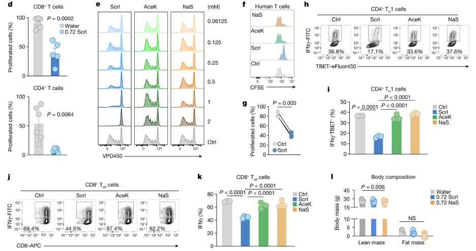 为研究三氯蔗糖对免疫系统的影响,研究人员对小鼠的B细胞、巨噬细胞等多种免疫细胞进行了免疫应答测试均未有影响。为研究三氯蔗糖对T细胞免疫应答的影响,他们将T细胞植入功能性T细胞和B细胞缺失的Rag2基因敲除小鼠中,并测量了三氯蔗糖处理后供体T细胞的稳态扩张情况,发现CD8+ 和 CD4+ T 细胞在三氯蔗糖处理的小鼠中稳态增殖均显著减缓。
