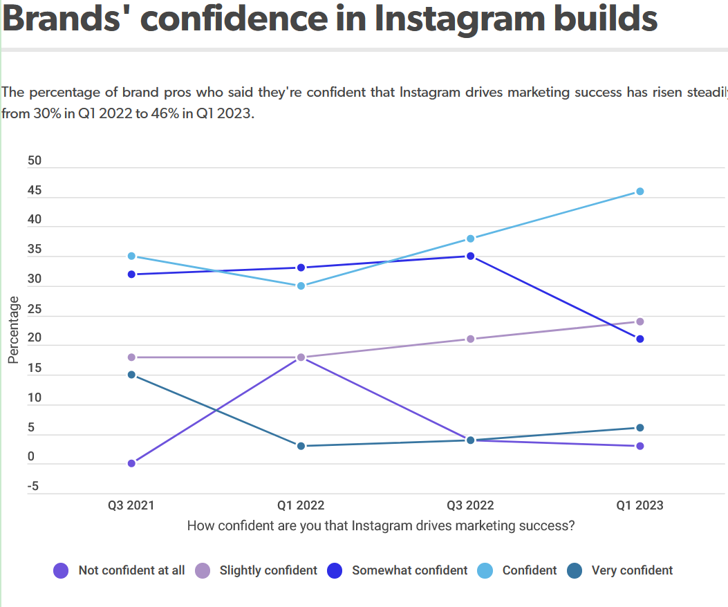 另一方面,对于品牌来说,对Instagram推动营销成功的能力的信心在去年稳步增长。2022年第一季度,30%的品牌专业人士对这个平台有信心。
