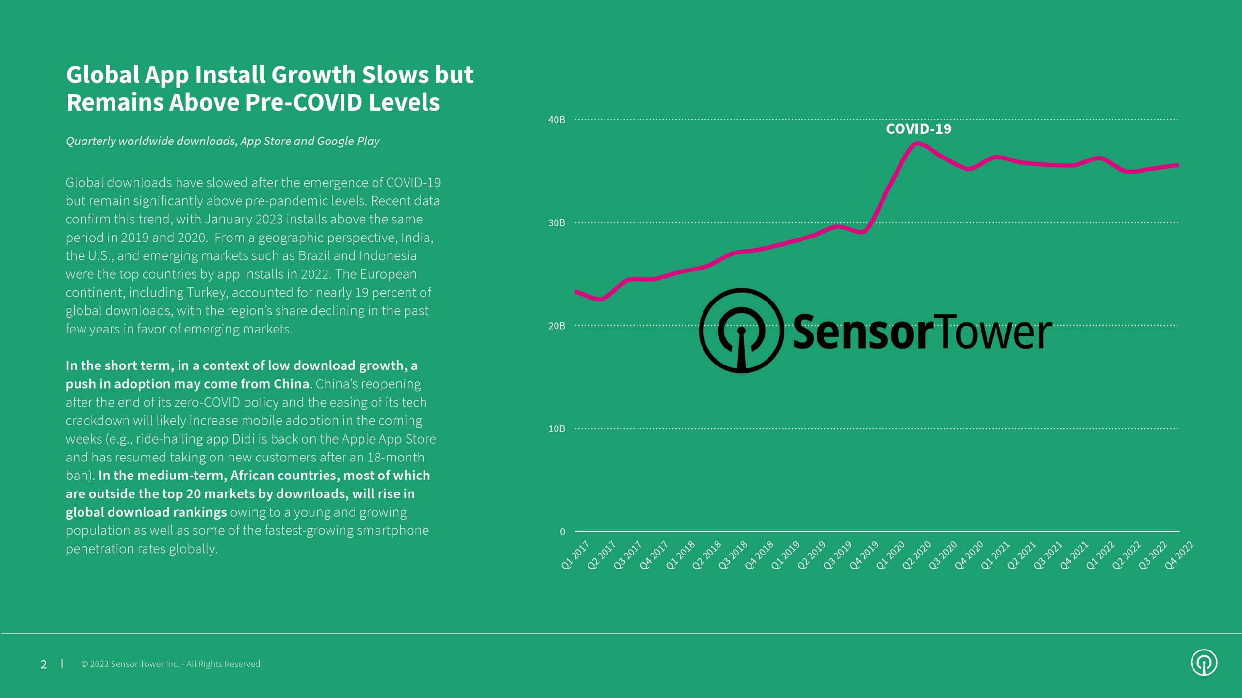 在2019冠状病毒病爆发导致全球下载量激增后,现在下载量有所放缓,但仍明显高于大流行前的水平。2022年,美国和包括印度、巴西和印度尼西亚在内的新兴市场是使用手机最多的国家。
