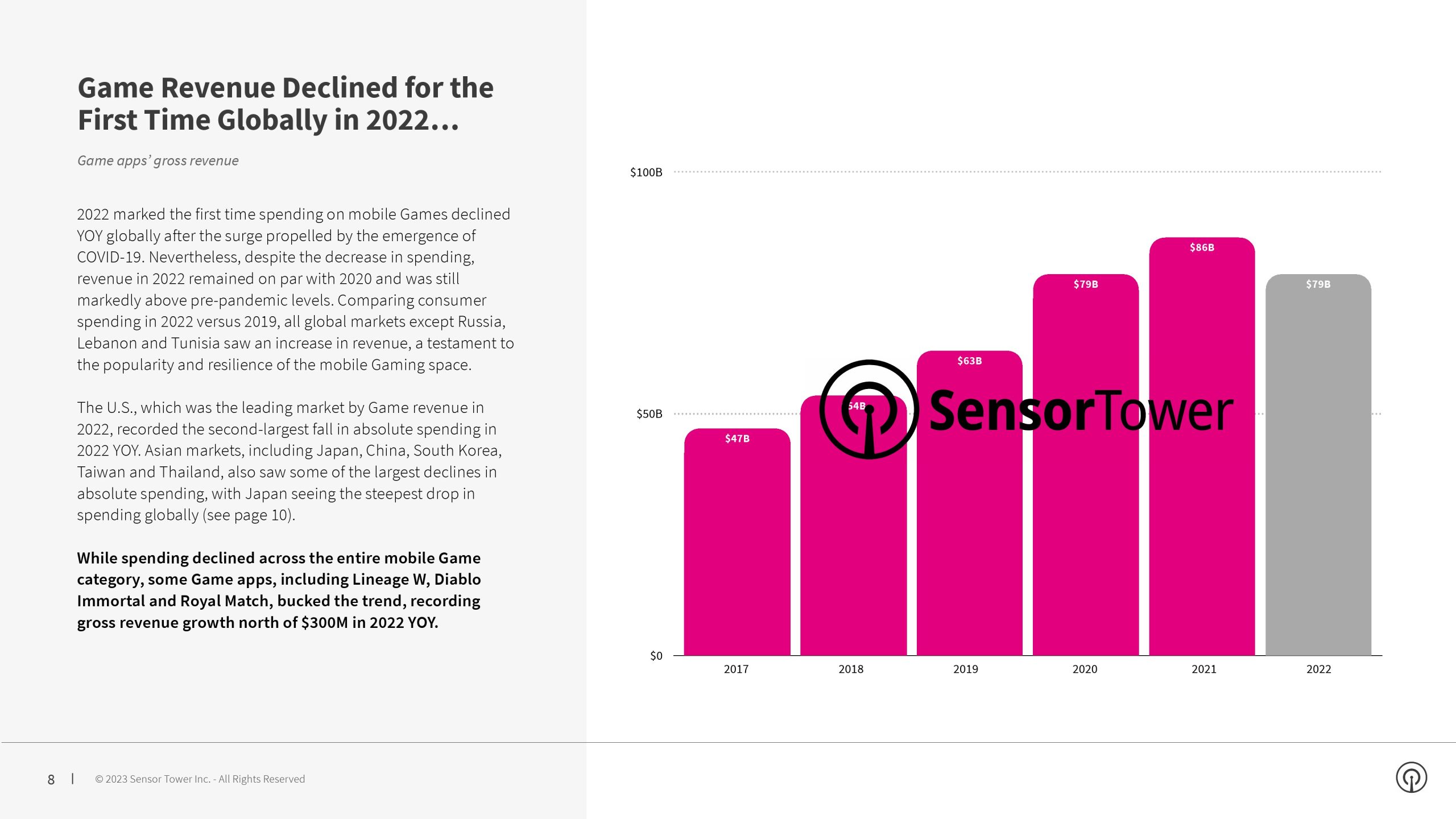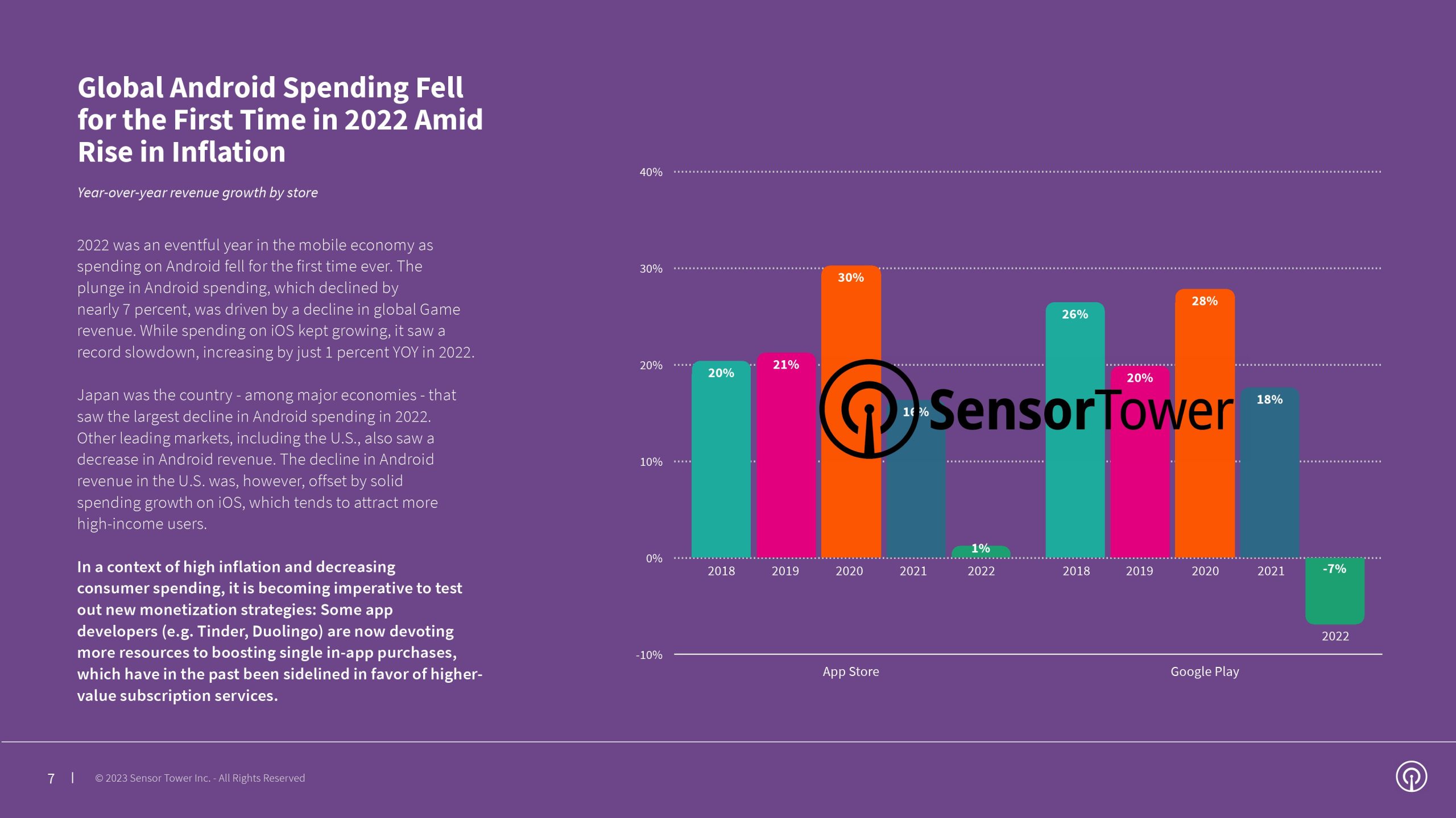 2022年全球消费者在安卓上的支出首次下降,由于全球手机游戏支出的放缓,其中日本是主要经济体中支出降幅最大的国家。