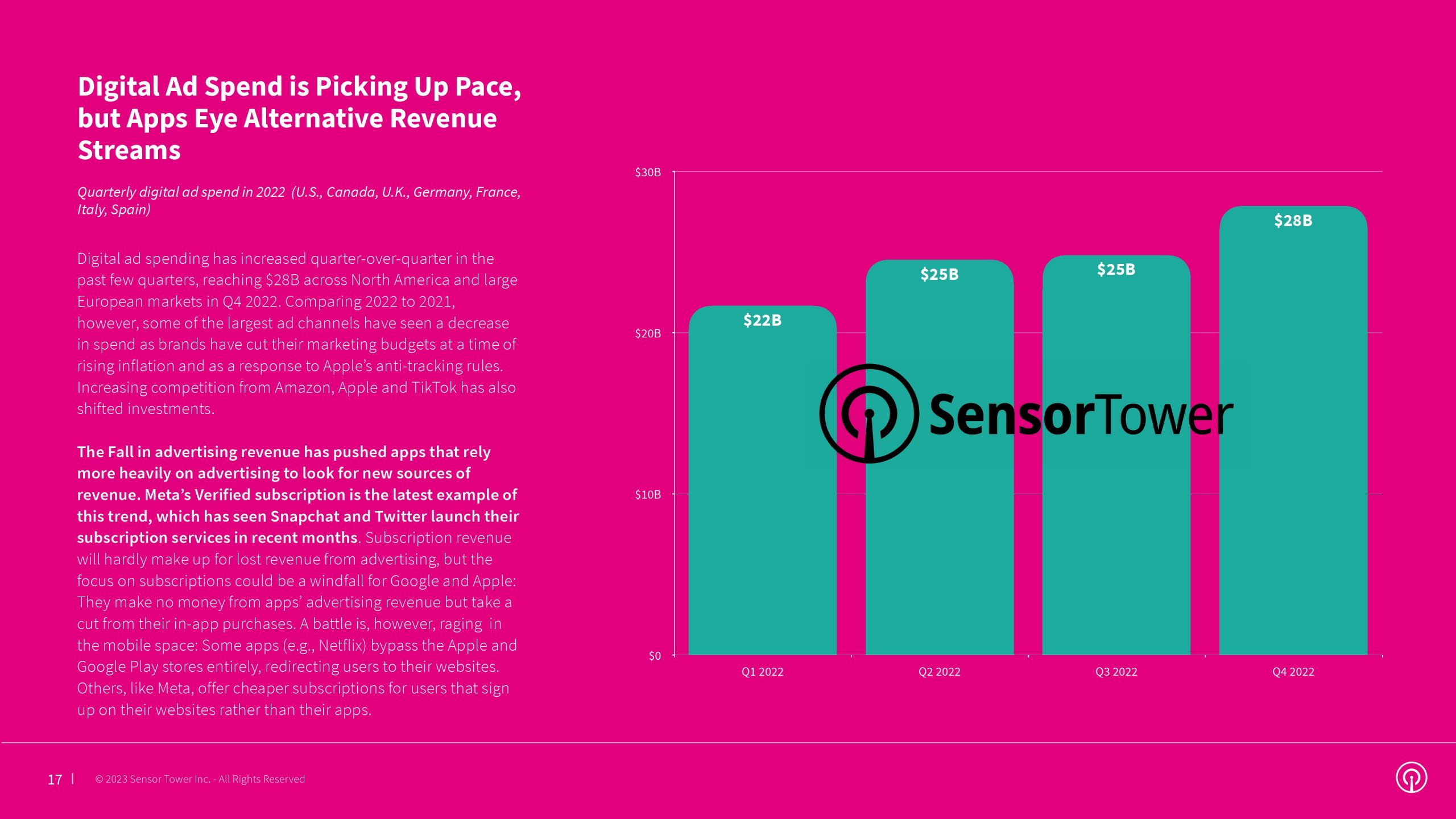 为了应对这些挑战,一些应用开发者更加关注单次应用内购买和后IDFA策略。其他应用——尤其是那些更加依赖广告的应用——正着眼于新的收入来源,推出订阅服务是社交网络应用日益增长的趋势。