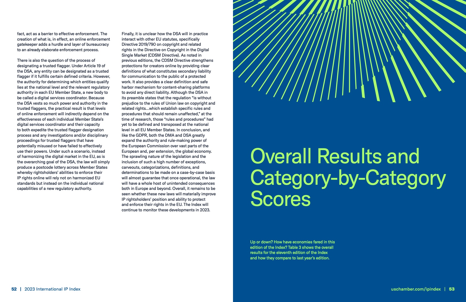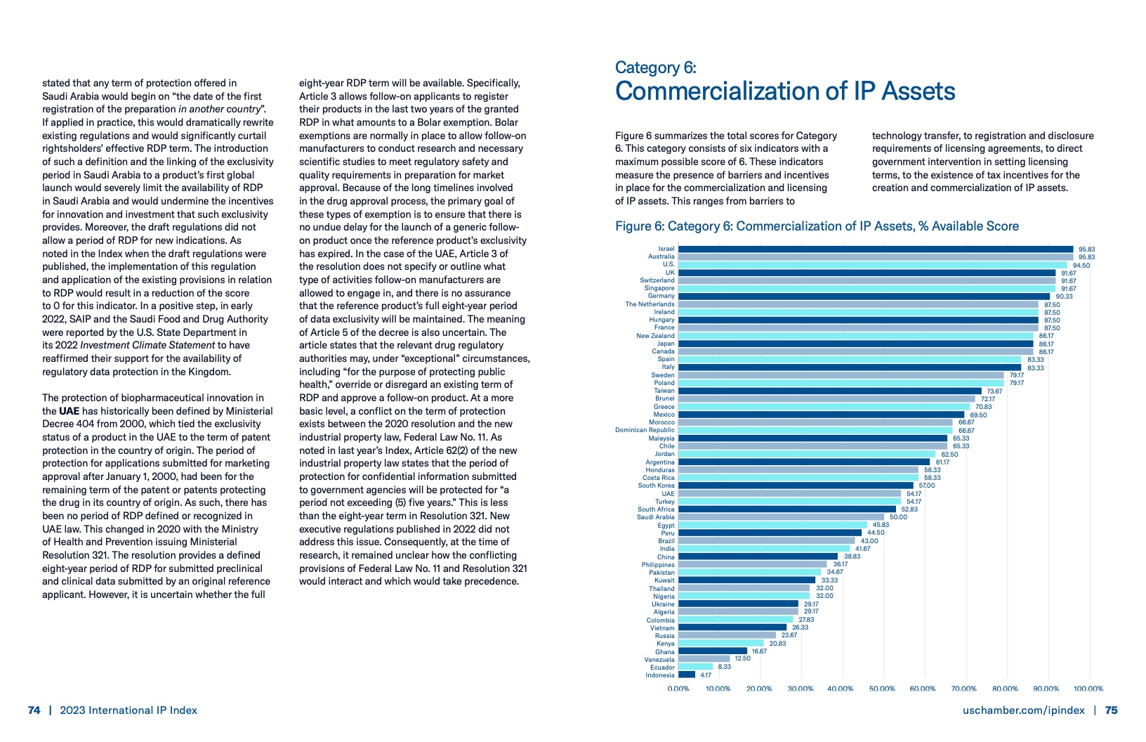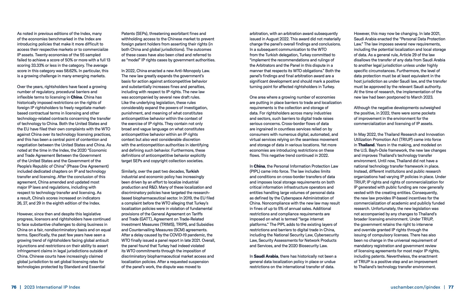 美国商会发布《2023年国际知识产权指数》报告,该报告通过50个指标(9个类别)对55个全球主要经济体的知识产权框架的强度和有效性进行评估。美国商会表示国际知识产权指数提供的数据不仅可以支持论点,还可以用来激发政策变化、推动创新向前发展。
