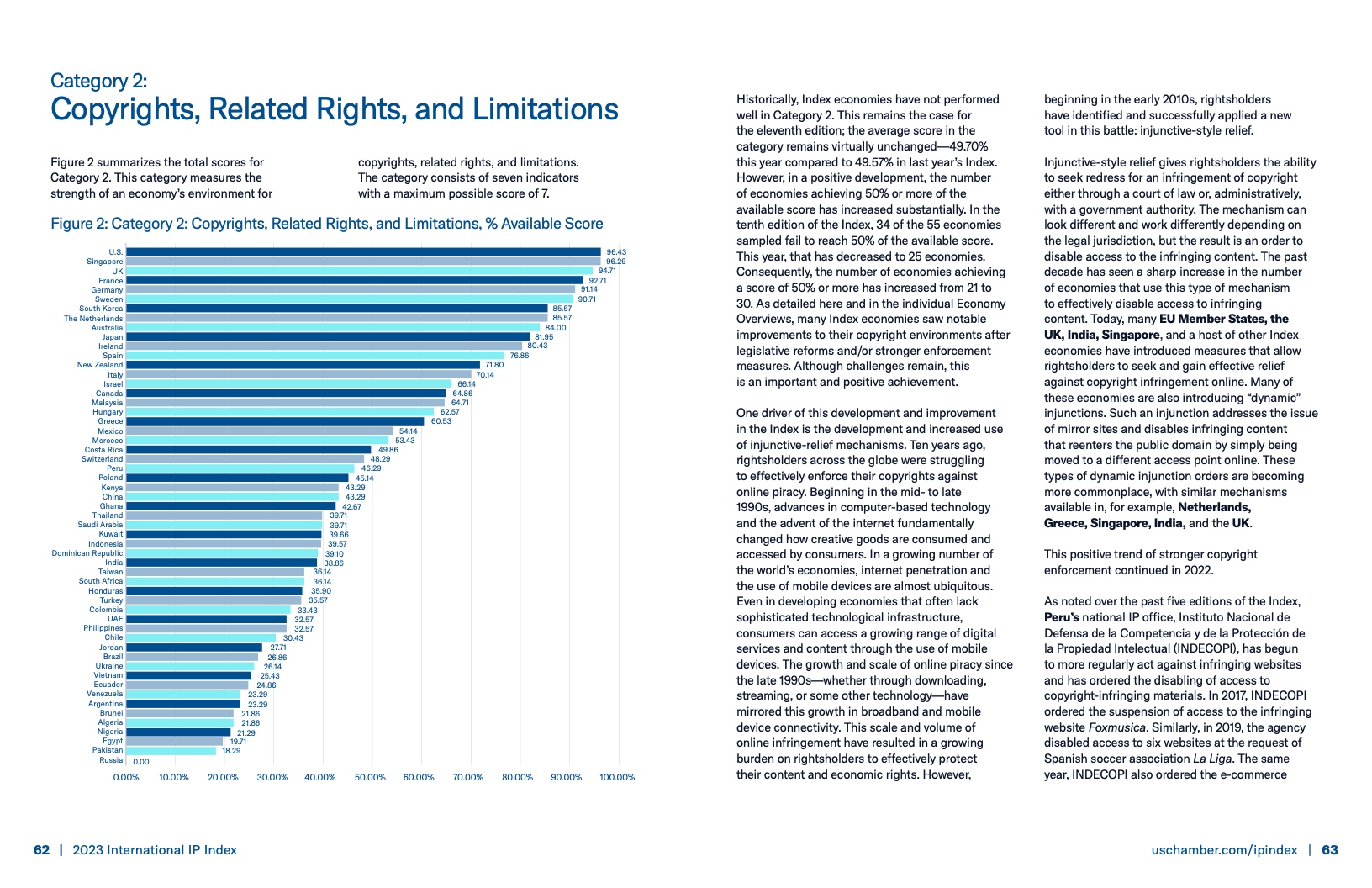 除泰国和越南外,马来西亚和新加坡的得分也有所提高,亚洲区域平均得分进步最大。由于俄罗斯针对国际版权所有者采取了一系列措施,俄罗斯的得分下降了21.62%。