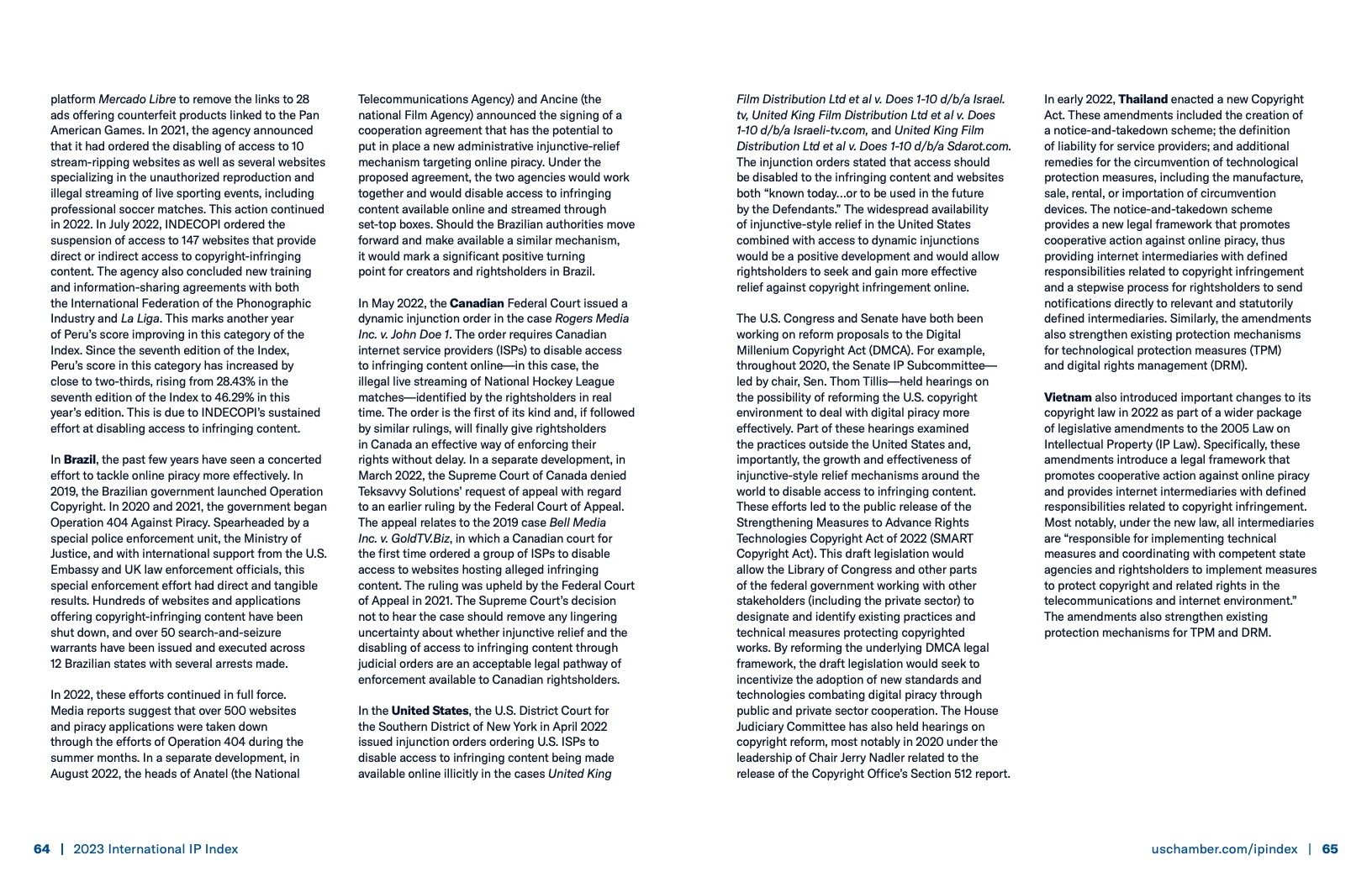 在拉丁美洲,秘鲁国家知识产权局和巴西的“打击盗版404行动”关闭了数百个包含盗版内容的网站。在加拿大,联邦法院发布了一项动态禁令,要求加拿大互联网服务商禁止非法在线直播国家冰球联盟比赛。在美国,一个地方法院发布了禁令,要求美国互联网服务商禁止对侵犯网络版权的内容进行访问。但是,美国仍然缺乏一个全面、现代的法律框架来打击网络商业盗版。
