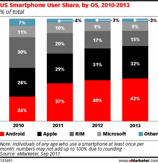 Android使用率的成长是以RIM的萎缩为代价的。eMarketer预计其市场份额将从2010年的30%萎缩至2013年的15%。微软和其他竞争对手的操作系统的份额则停滞不前。