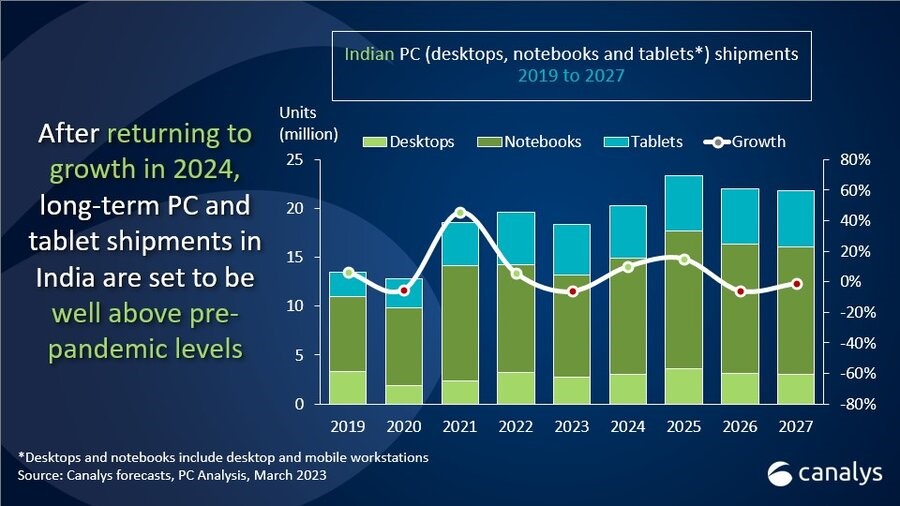 展望未来,Canalys预计,2023年印度的个人电脑和平板电脑出货量将下降6%,至1800万台。这比全球市场的降幅(-9%)要小。尽管今年全球经济疲软将影响印度,但与其他主要市场相比,印度的GDP增长预测仍相对乐观。