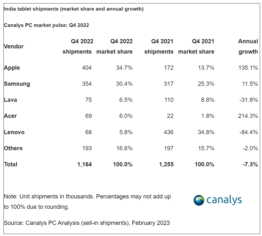 苹果公司在2022年第四季度超越三星,在印度平板电脑市场占据领先地位,其新款iPad在假日季推出时取得了巨大成功。尽管丢掉了头把交椅,但三星的季度表现相对不错,出货量同比增长12%。Lava在本季度排名第三,在2022年排名第四。它在教育领域的强大地位将推动2023年及以后的增长。第四季度,宏碁(Acer)和联想(Lenovo)也进入了前五名。