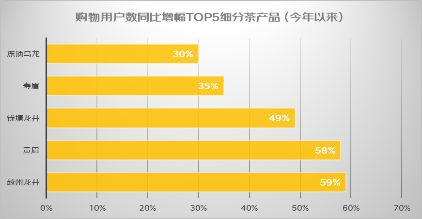 从细分茶类的占比来看,红茶中,金骏眉和正山小种的购物用户数合计占比超60%;绿茶中,毛尖和碧螺春的购物用户数合计占比超40%;白茶中,寿眉和白牡丹的购物用户数合计占比超60%;乌龙茶中,大红袍和单枞的购物用户数合计占比超60%。在茶味衍生产品中,茶味面点、茶味冲调品、茶味漱口水的购物用户数同比增幅分别达322%、120%、70%。