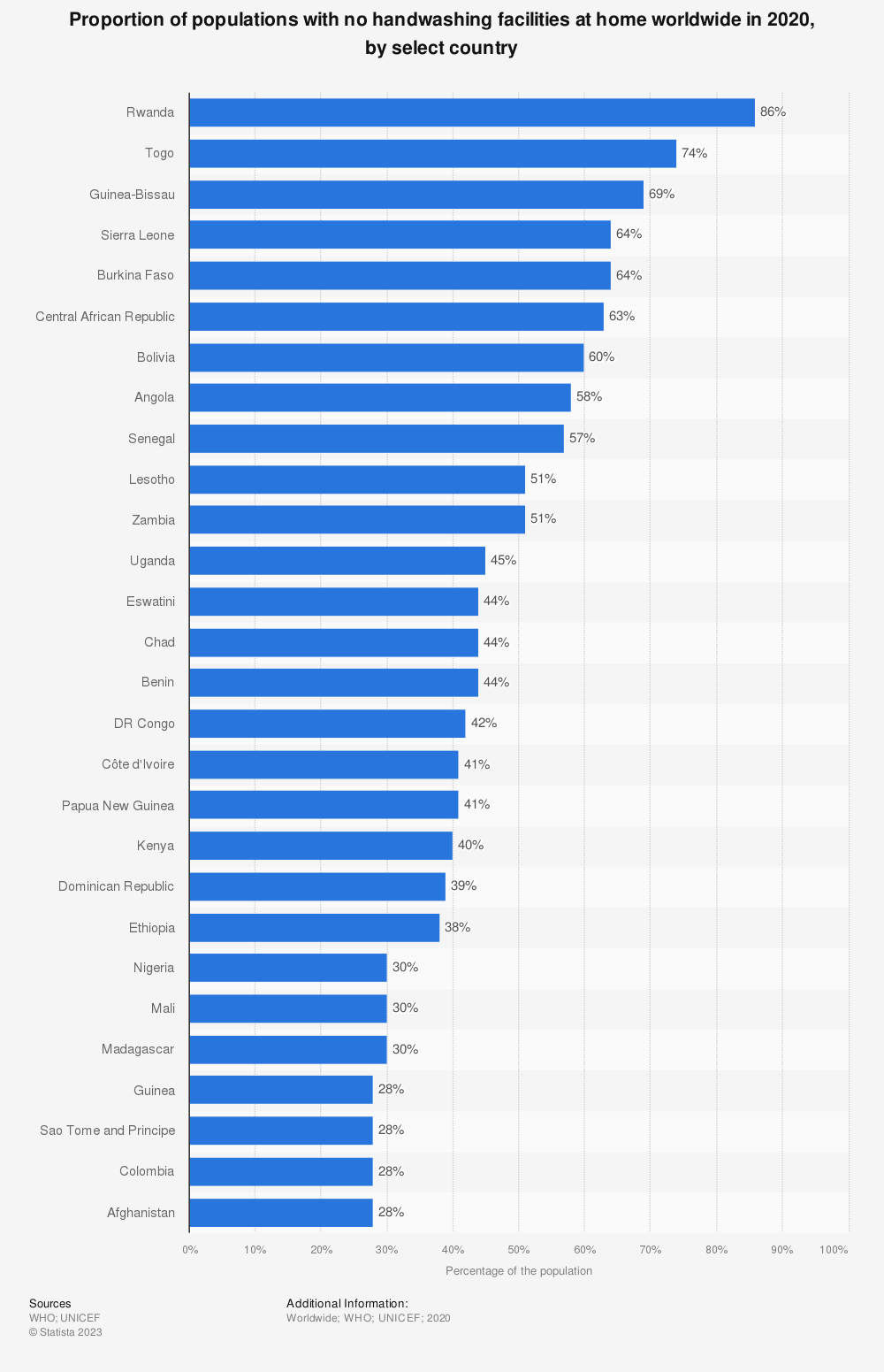 世界各地获得水的途径不同,也造成了基本卫生条件的巨大差距。在2020年,全球有9%的人口在家中无法使用基本的洗手设施。同样,受此影响的人口比例最大的是撒哈拉以南非洲。例如,在卢旺达,每10个人中只有不到2个人可以使用洗手设施,这是全世界这项服务覆盖率最低的国家。联合国的可持续发展目标(Sustainable Development Goals-SDG)旨在增加全球洁净水的获取和改善卫生服务。