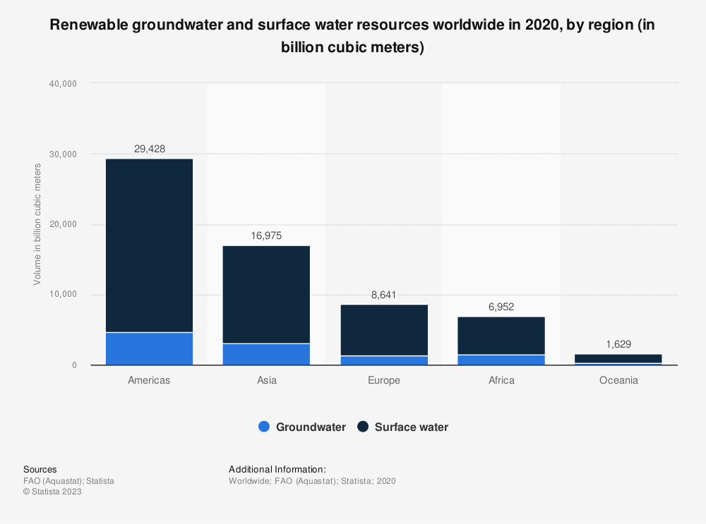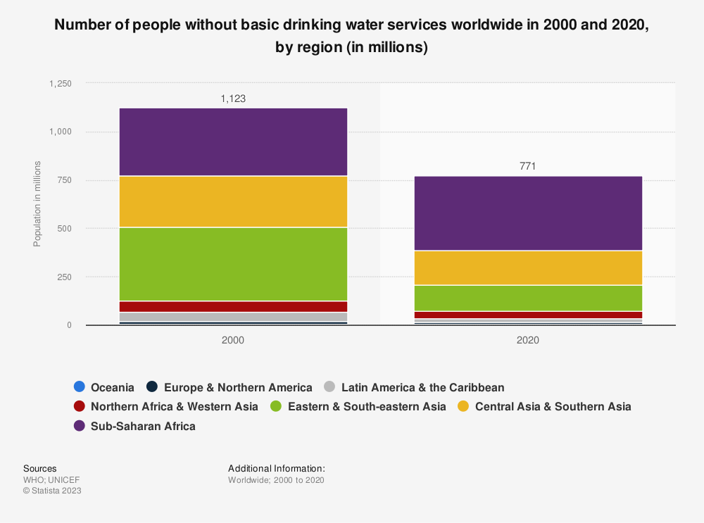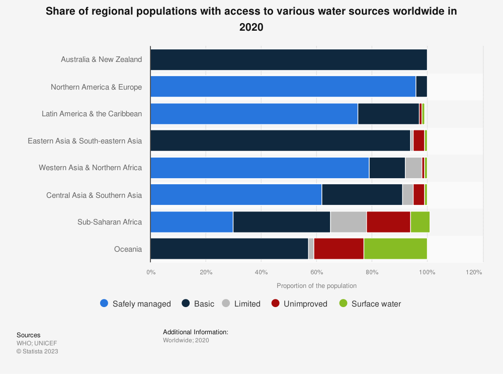 虽然获得水和卫生设施是基本的人权,但水资源不平等仍然是世界范围内的一个重大问题。尽管在过去20年里,缺乏基本饮用水服务的人数减少了30%以上,但到2020年,仍有大约8亿人缺乏基本饮用水。其中一半以上的人居住在撒哈拉以南非洲地区。事实上,自本世纪初以来,该地区缺乏基本饮用水的人数估计增加了4000万。在2020年,大洋洲和撒哈拉以南非洲地区超过20%的人口依赖于未经改良的水或地表水源。相比之下,澳大利亚、新西兰、北美和欧洲的大部分饮用水是安全管理的。不安全的水源会加剧营养不良,是霍乱、痢疾和脊髓灰质炎等传染病的主要风险因素之一。
