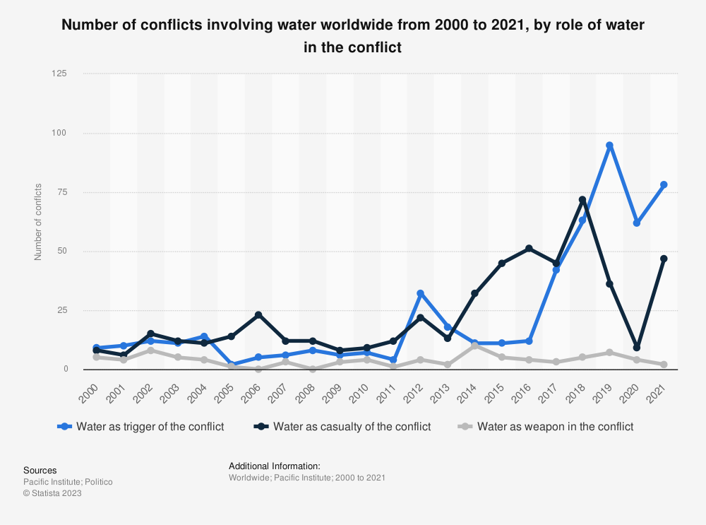 由于淡水资源和水的获取在世界各地区分布不均,预计水资源的短缺将成为政治和地理冲突的主要原因。在过去十年中,由水引发的冲突数量大幅增加,仅2021年就记录了近80起。在21世纪,西亚和南亚以及撒哈拉以南非洲等干旱地区是受水冲突影响最严重的地区。