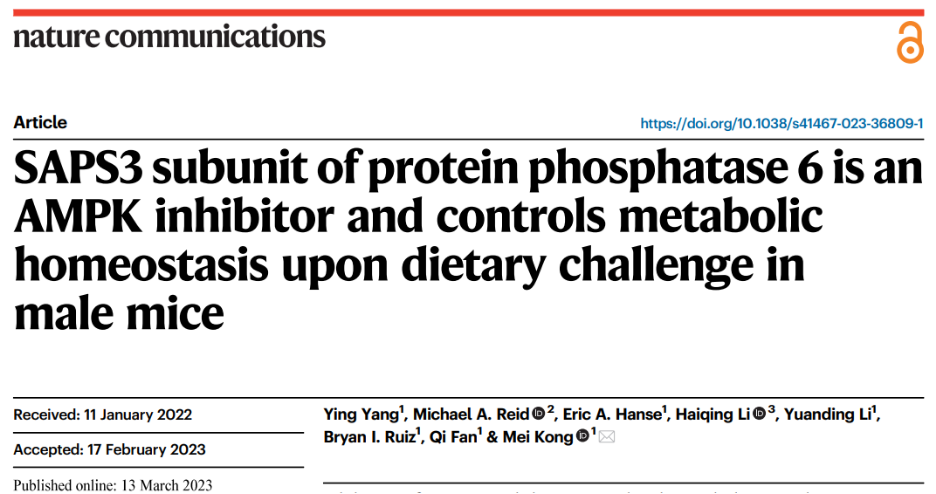 【1】Yang, Y., Reid, M.A., Hanse, E.A. et al. SAPS3 subunit of protein phosphatase 6 is an AMPK inhibitor and controls metabolic homeostasis upon dietary challenge in male mice. Nat Commun 14, 1368 (2023). https://doi.org/10.1038/s41467-023-36809-1