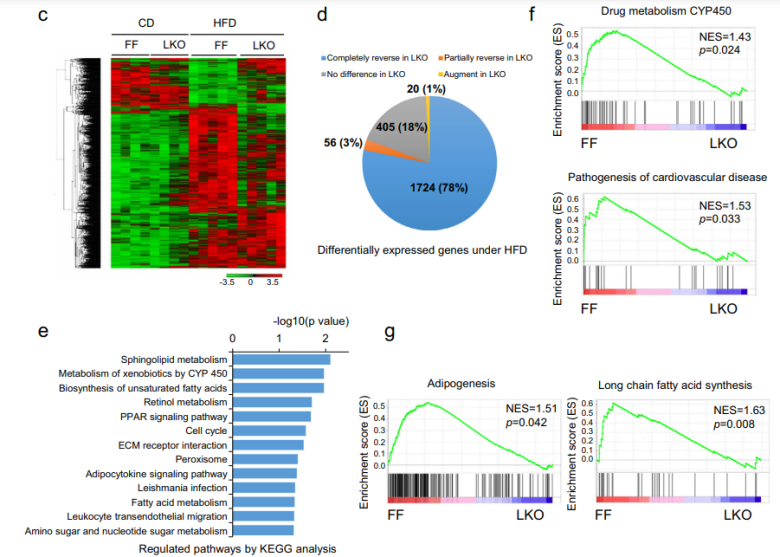 研究人员继续对小鼠的肝脏组织进行了RNA测序(RNA-Seq)来探究在高脂饮食下SAPS3是否从基因转录水平影响小鼠的代谢。RNA 表达谱数据表明,SAPS3 的缺失对均衡饮食影响有限,而对高脂饮食下的基因表达有显著影响。比如脂肪生成和长链脂肪酸合成因 SAPS3 的缺失而受损。令人欣喜的是,SAPS3的敲除降低了心血管疾病发病机制相关基因的转录水平。