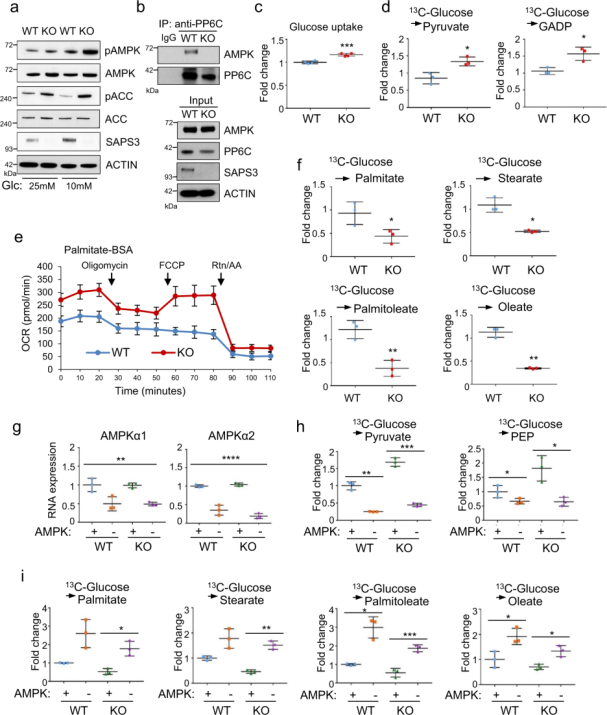 AMPK在SAPS3 缺失影响肝脏代谢的过程中是否起到了重要作用呢?为了回答这个问题,研究人员在小鼠胚胎成纤维细胞(MEF)中敲除AMPK的组分后,利用13C同位素示踪法研究葡萄糖和脂肪酸的代谢产物。实验结果发现SAPS3的缺失可增强糖酵解中间产物的生成,而AMPK 的敲除则阻断了这一过程。