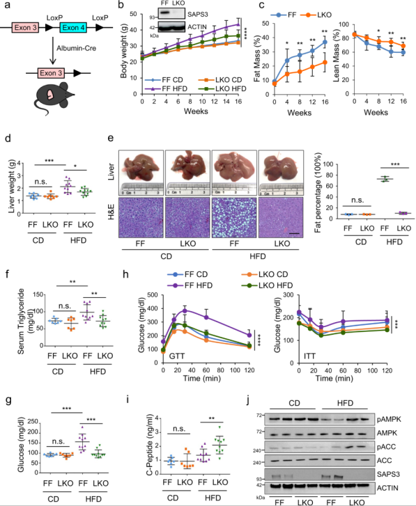 图注:小鼠中SAPS3 的肝脏特异性缺失足以改善高脂肪饮食带来的全身反应