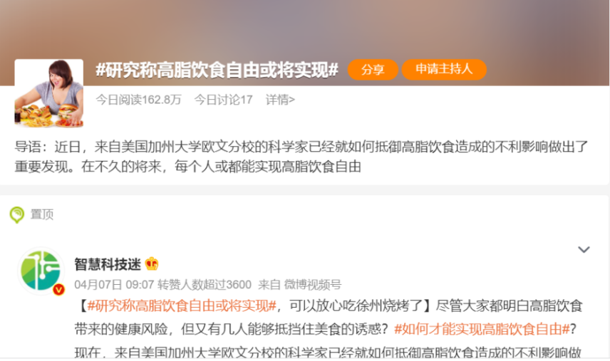 近日,一条“研究称高脂饮食自由或将实现”的微博话题引起网友们的广泛关注。不少网友表示自己已经准备好实现饮食自由了。