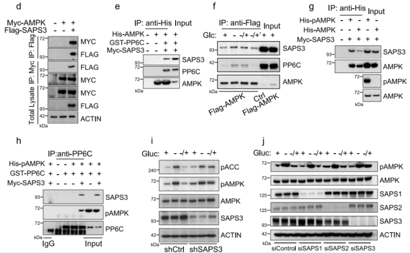 那么,含SAPS3的PP6复合物是否能响应葡萄糖匮乏的营养条件将AMPK 去磷酸化呢?蛋白共表达和免疫共沉淀实验表明SAPS3/PP6复合物可在葡萄糖匮乏的条件下与磷酸化的AMPK结合,PP6催化亚基与AMPK的结合需要SAPS3的参与。