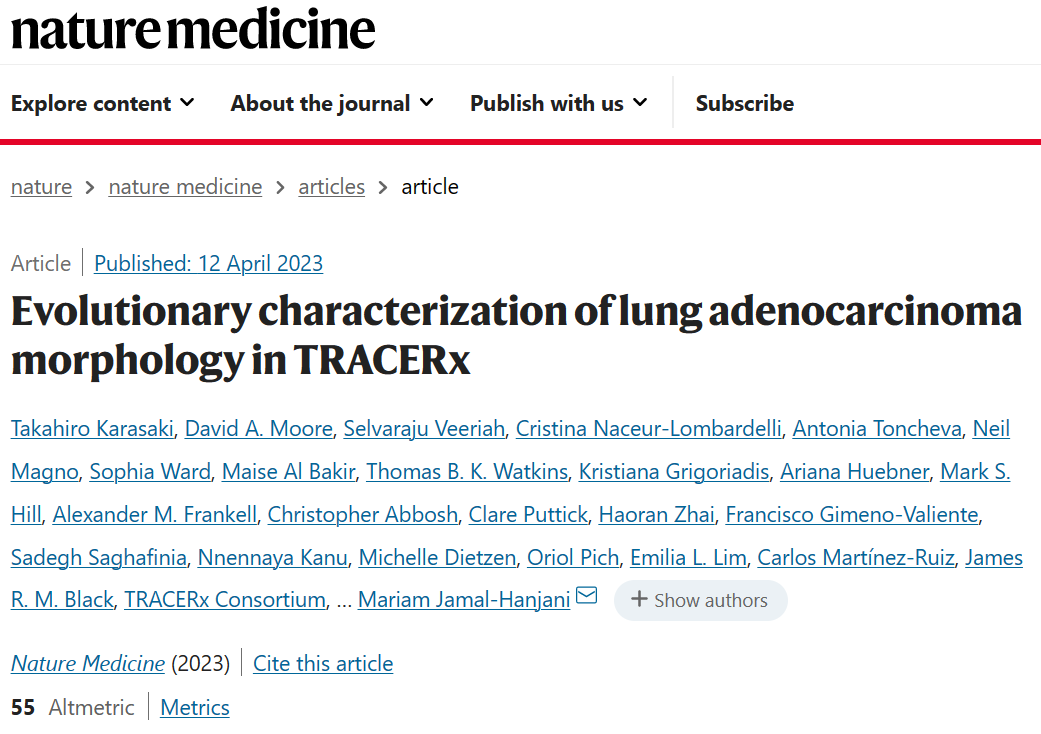 [7]Karasaki, T., Moore, D.A., Veeriah, S. et al. Evolutionary characterization of lung adenocarcinoma morphology in TRACERx. Nat Med (2023). https://doi.org/10.1038/s41591-023-02230-w