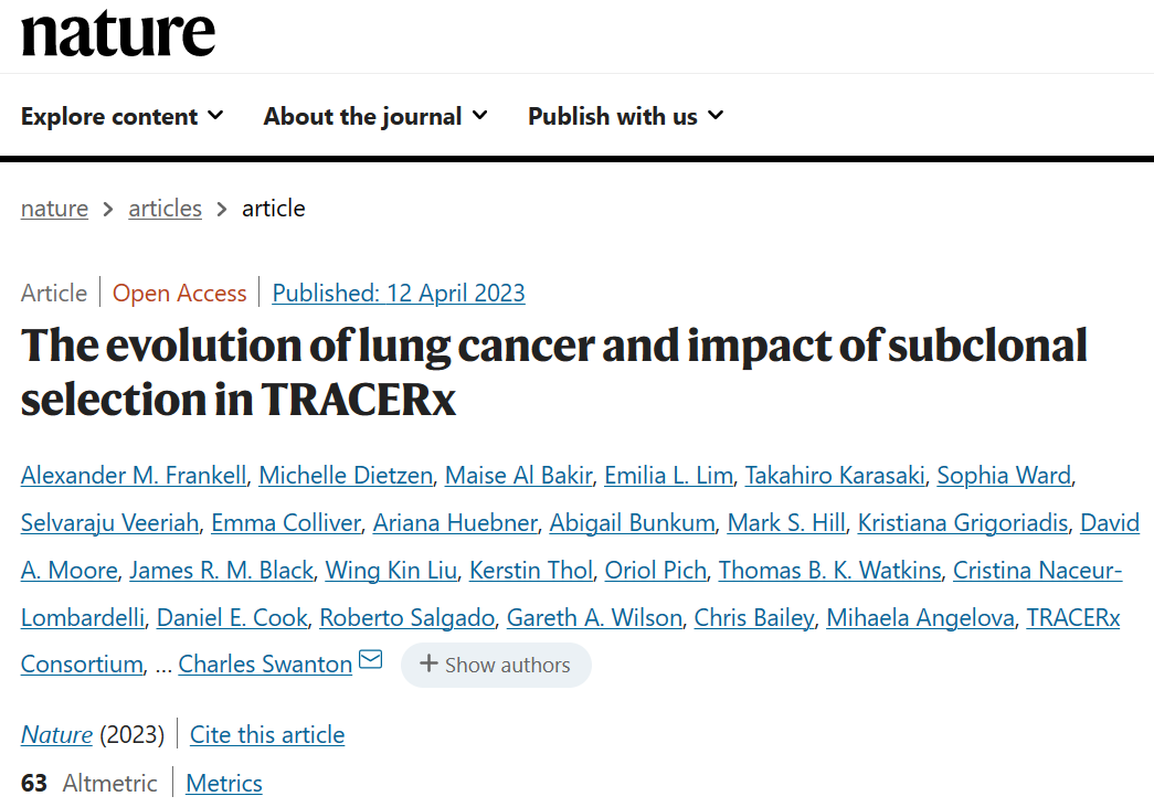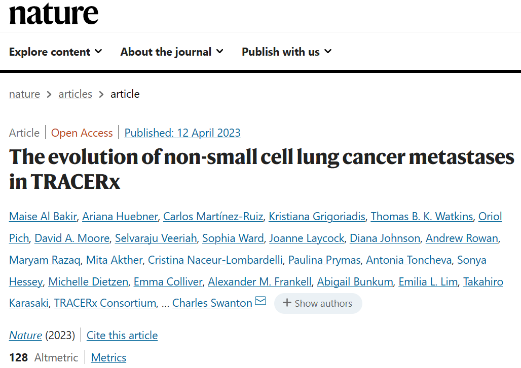 [2]Al Bakir, M., Huebner, A., Martínez-Ruiz, C. et al. The evolution of non-small cell lung cancer metastases in TRACERx. Nature (2023). https://doi.org/10.1038/s41586-023-05729-x