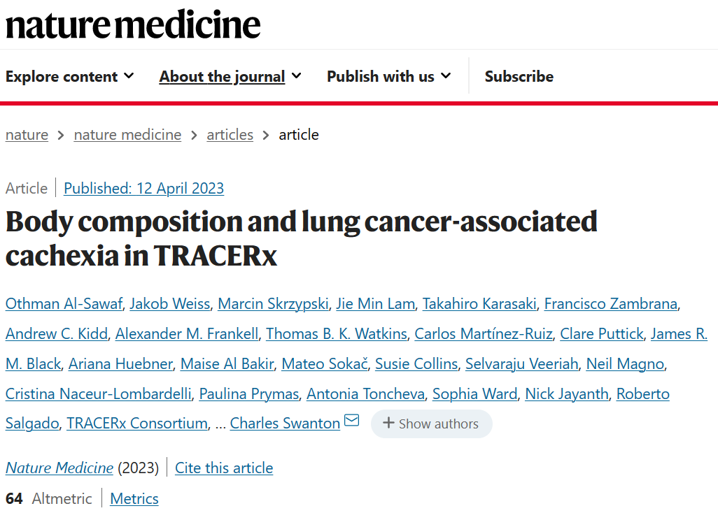 [6]Al-Sawaf, O., Weiss, J., Skrzypski, M. et al. Body composition and lung cancer-associated cachexia in TRACERx. Nat Med (2023). https://doi.org/10.1038/s41591-023-02232-8