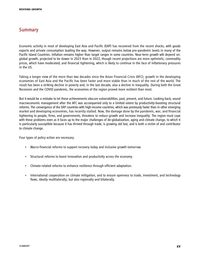 世界银行东亚与太平洋地区副行长曼努埃拉·V·菲罗指出:“东亚太平洋地区的大多数主要经济体都已克服疫情带来的困难,但现在必须应对全球格局的变化。为了重新获得动力,还有工作要做,要促进创新,提高生产率,为更绿色的复苏奠定基础。”