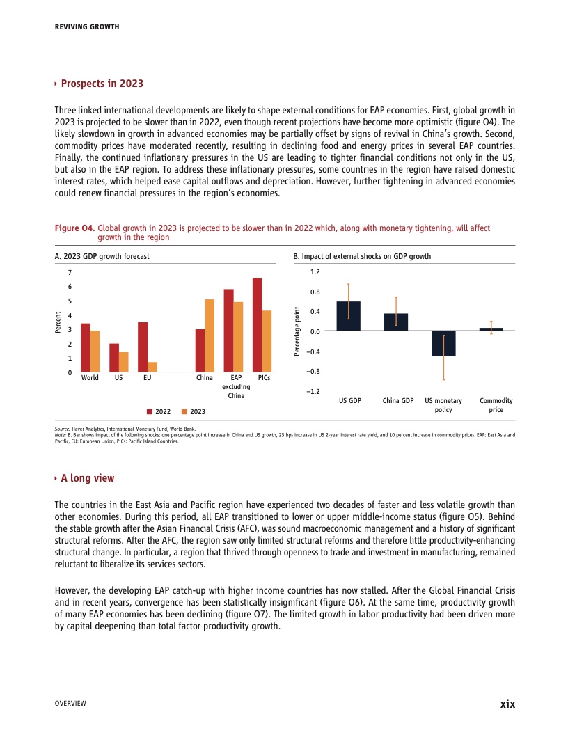 世界银行2023年4月期《东亚与太平洋地区经济半年报》指出,今年该地区的经济表现虽然强劲,但可能会因全球增长放缓、大宗商品涨价以及为应对持续通胀导致的金融条件收紧而受到拖累。