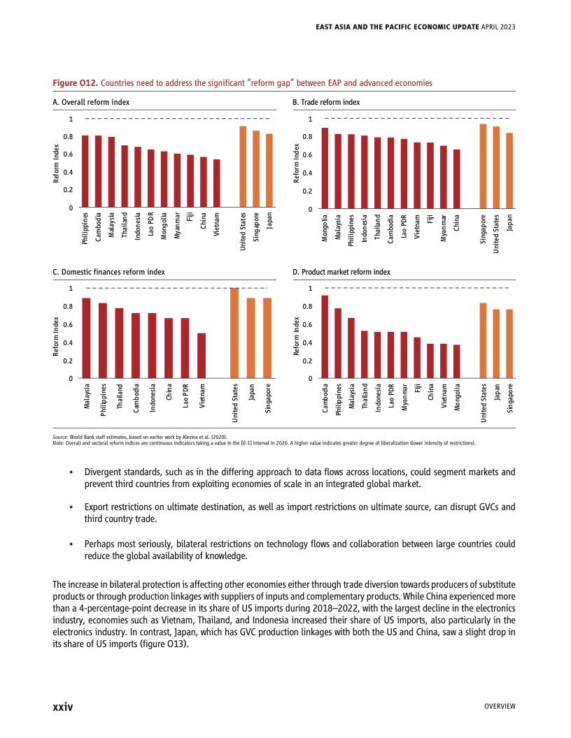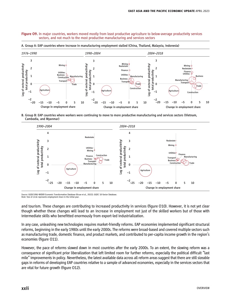 东亚太平洋地区的大多数国家都经历了20年比其他地区经济体更快、更稳定的增长。结果是在过去十年中贫困率显着降低,不平等现象减少。近年来,随着时间的推移生产率增长和结构改革步伐放缓,追赶发达经济体人均收入水平的步伐停滞不前。缩小巨大的“改革差距”,特别是在服务领域,能够提高数字革命的效果,并进一步提升从零售和金融到教育和医疗保健等行业的生产力。