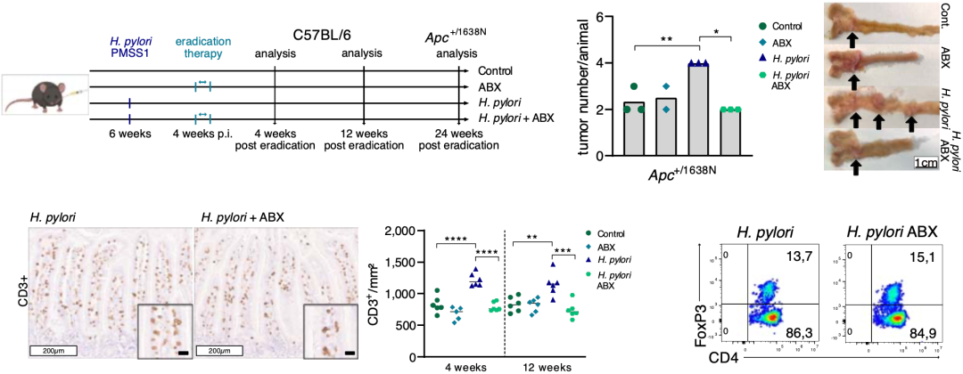 基于无菌小鼠和粪菌移植实验,Gerhard团队证实幽门螺杆菌诱导的肠道微生物变化对肠癌的发展贡献很大。而幽门螺杆菌感染的三联疗法,可以让Apc突变型小鼠模型肠癌负担与未感染对照组相当,还可以让小鼠肠道免疫环境正常化。