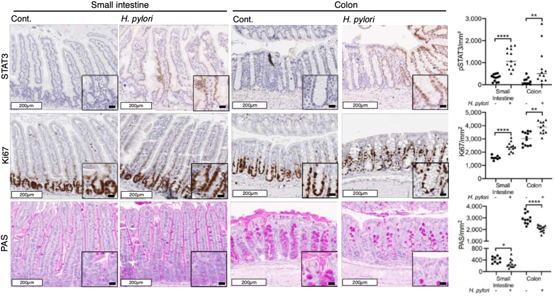 为了搞清楚胃部感染幽门螺杆菌对肠道致癌信号的影响,Gerhard团队又评估了幽门螺杆菌感染小鼠肠道上皮细胞基因表达情况的变化,尤其是STAT3和NF-κB等与肠癌启动和发展相关的信号通路。