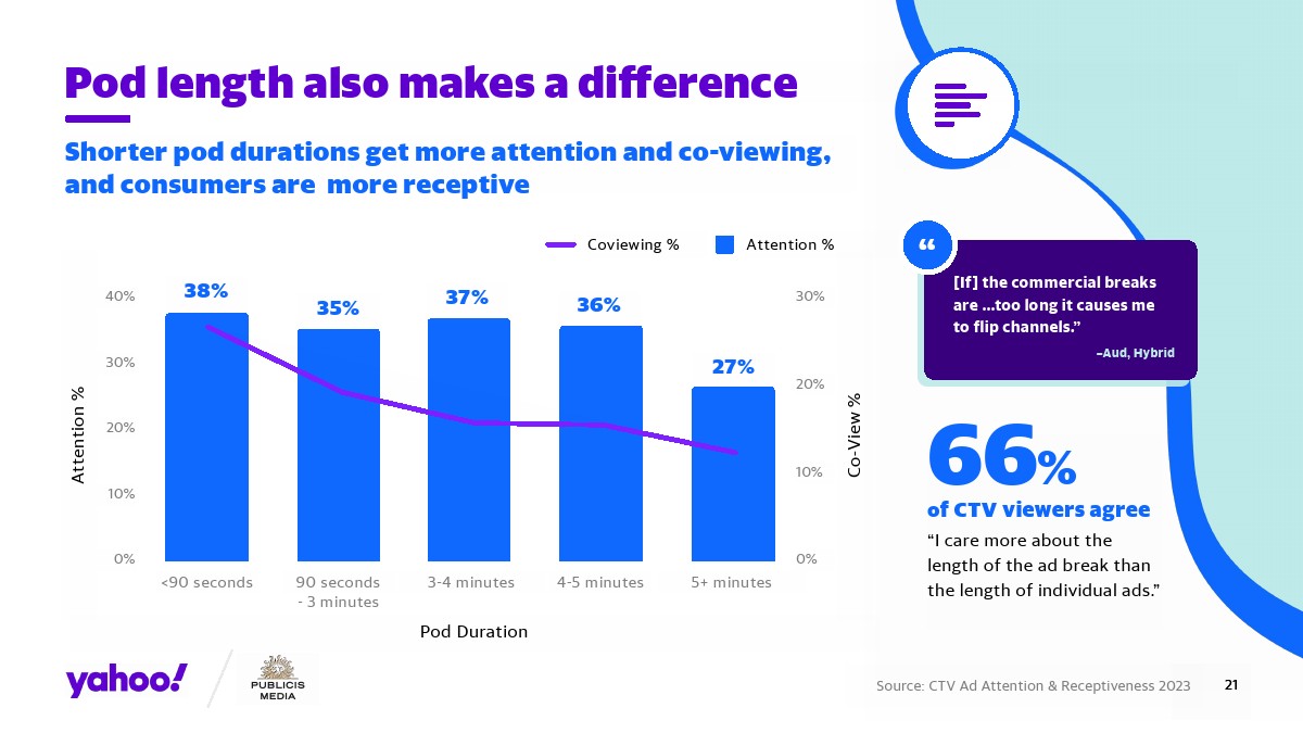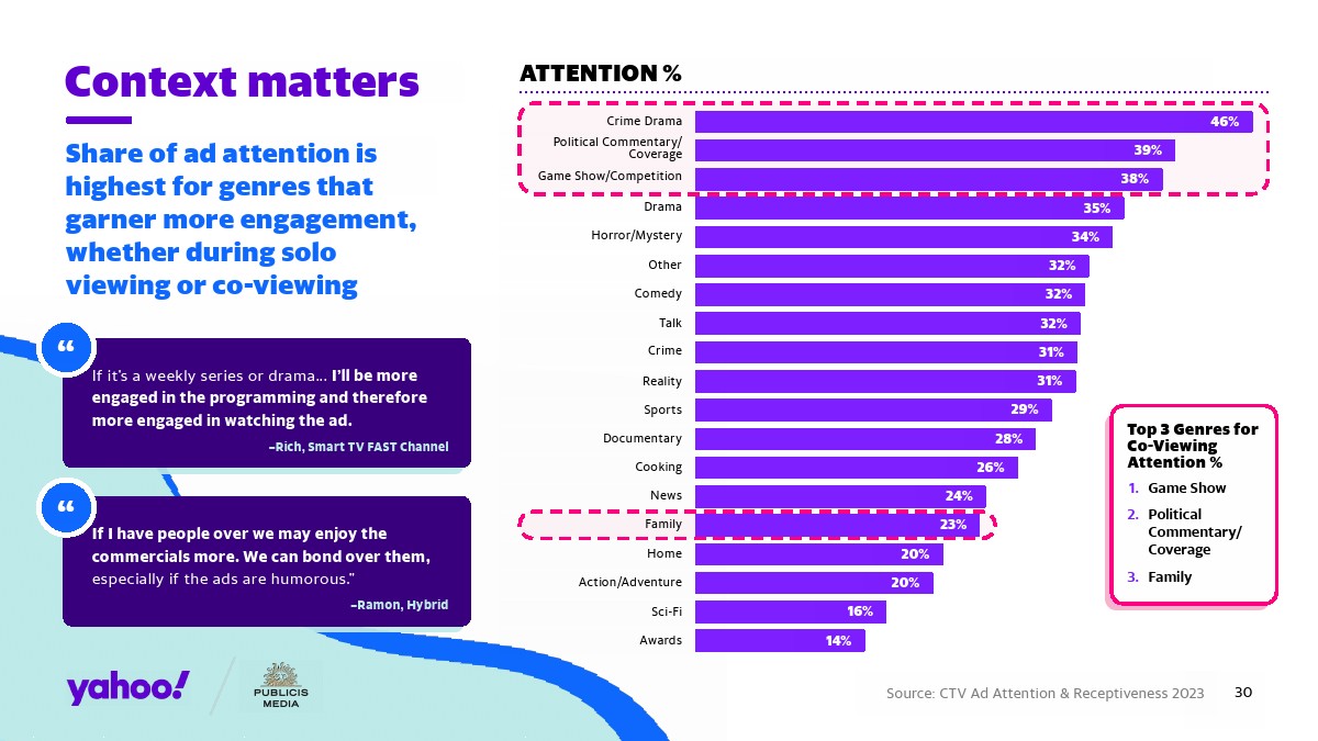 除了幽默之外,CTV 观众还欣赏切中要害(61%) 以及带有优美音乐或朗朗上口的顺口溜(59%) 的广告。 后一点很重要,因为研究结果表明“音频在注意力不集中的环境中至关重要。”