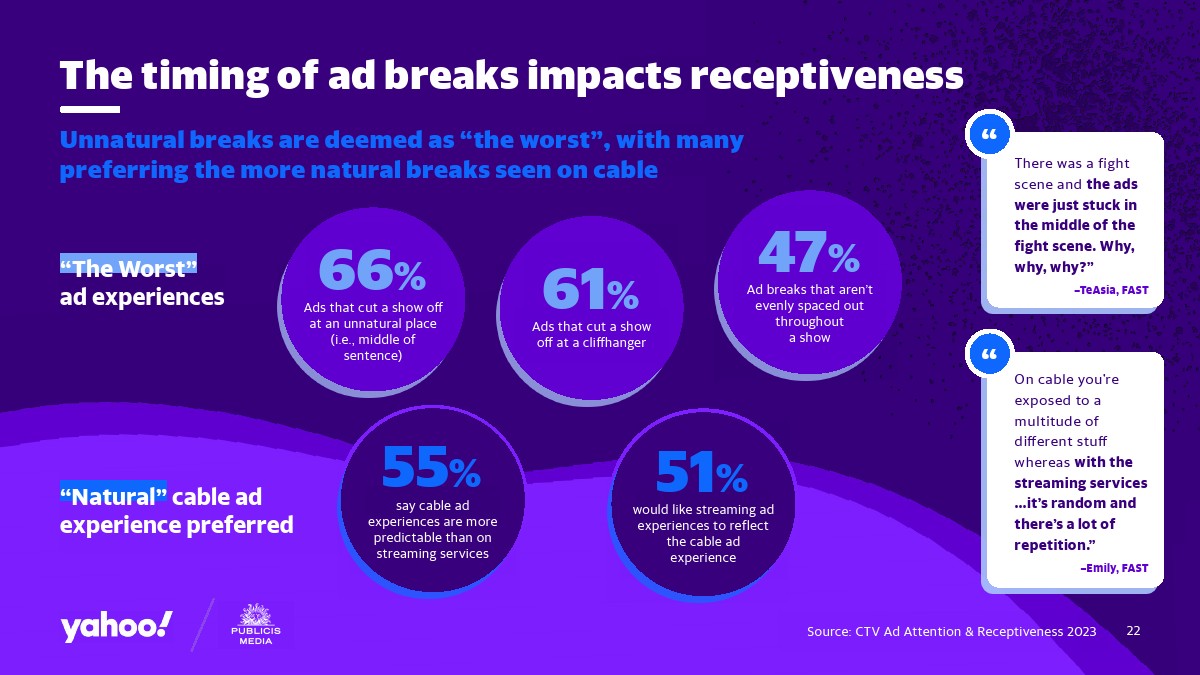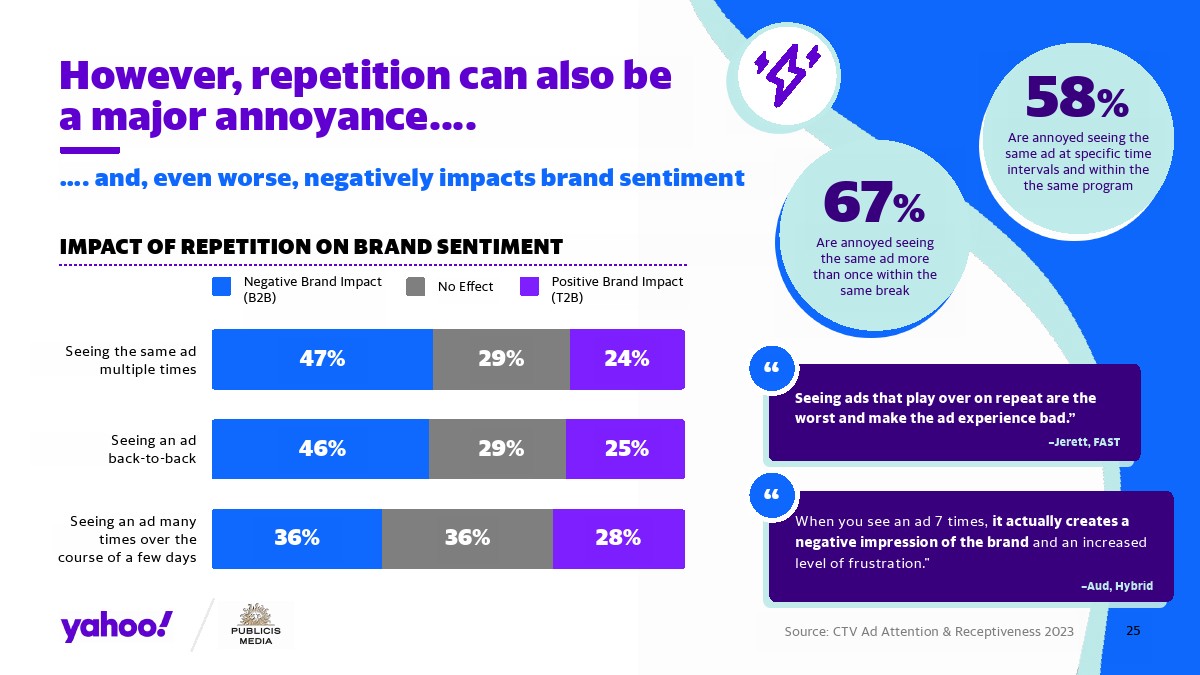 同时,广告体验的某些部分可能会让观众感到沮丧。 例如,几乎一半的人(47%)表示多次看到同一个广告会对品牌情绪产生负面影响;几乎相同比例的人(46%)对连续看到一个广告有同样的感觉。 2/3的观众对在同一时间间隔内多次看到同一广告表示恼火;58%的观众对在特定时间间隔和同一节目中看到同一广告感到恼火。