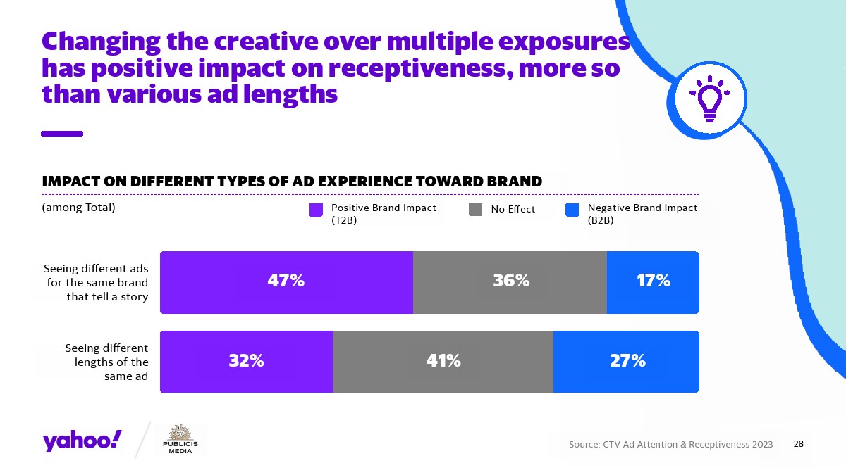 相比之下,看到同一品牌的不同广告讲述一个故事更有可能对广告品牌产生正面(47%) 而非负面(17%) 情绪。