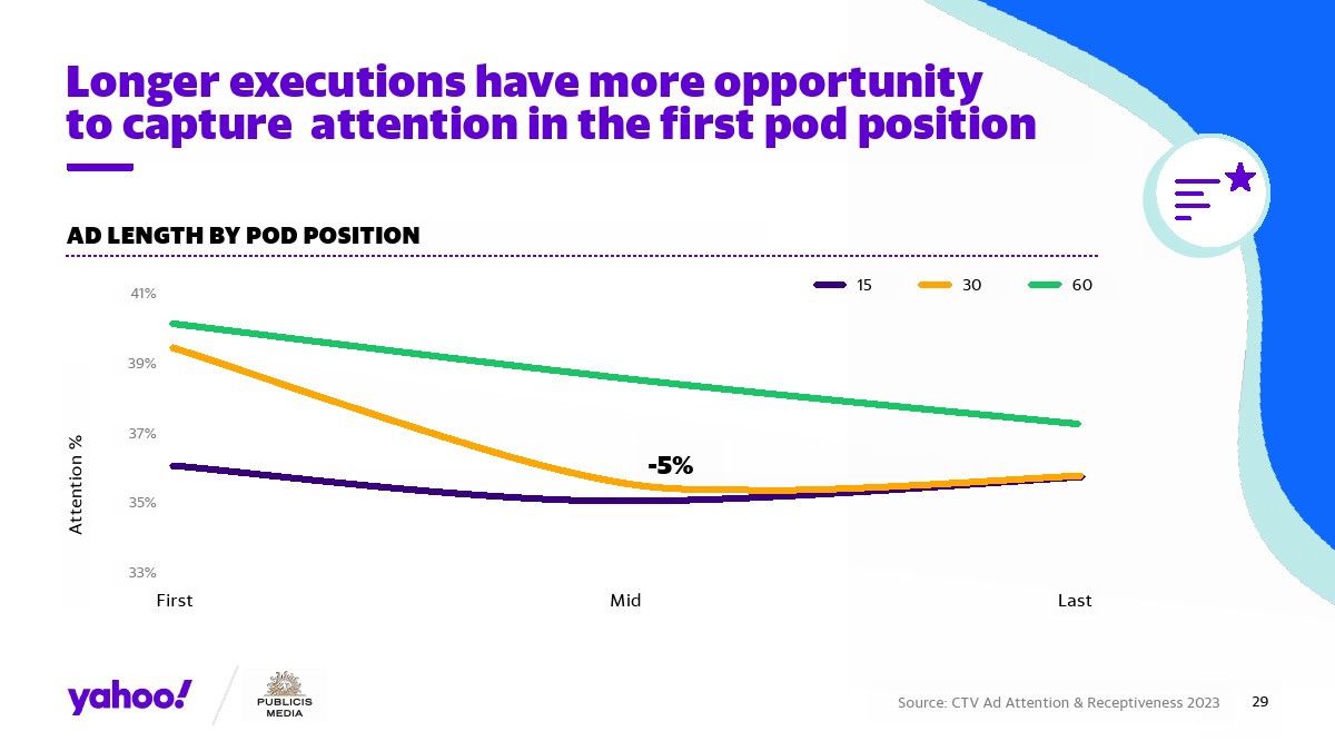 - 就整体时间而言,较长的广告会获得更多关注,但广告越长,观看的可能性越低。