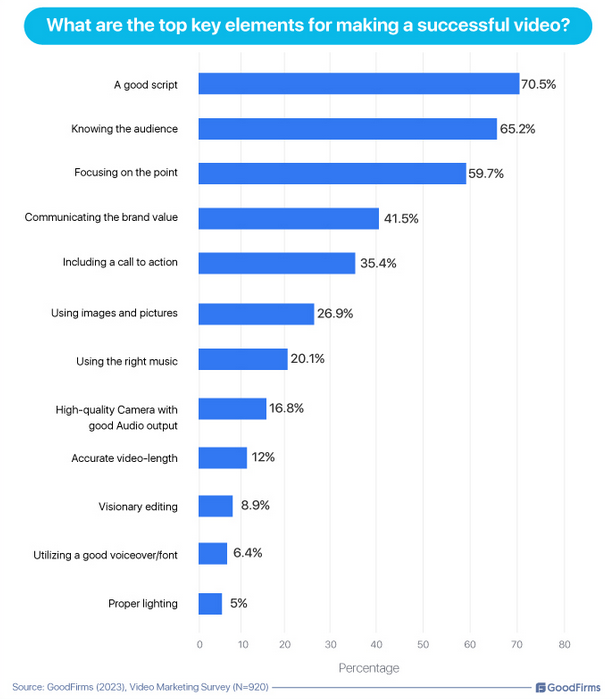 70.5% 的受访者认为好的视频脚本是成功营销视频的关键要素。