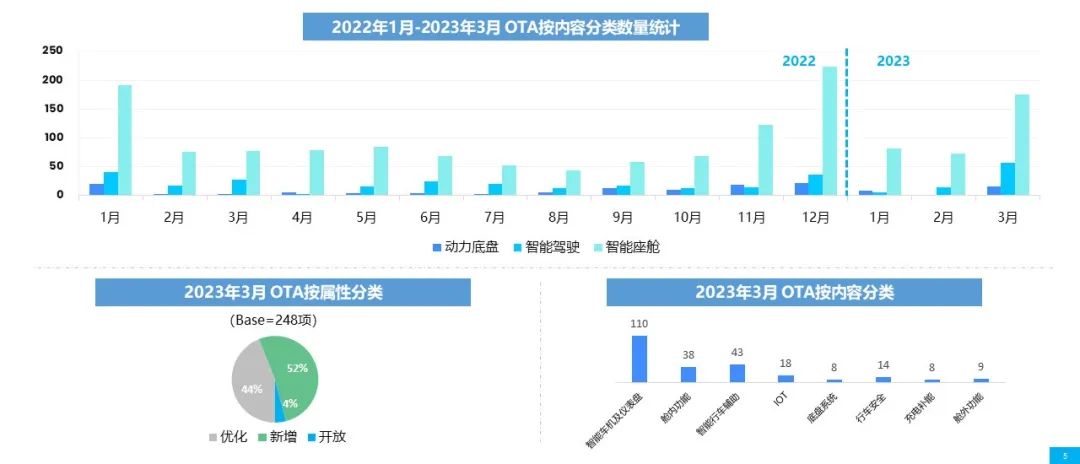 - 新势力共计更新248项内容,在经历1-2月节奏放缓以后,在本月集中释放。整体上都有一个明显的增长,尤其在智能车机及仪表、智能行车辅助、IOT方面。