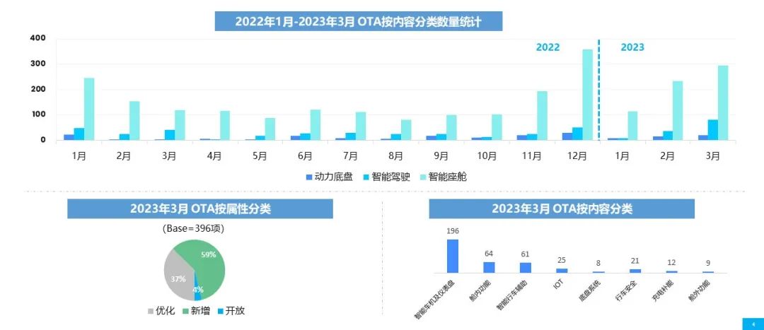 - 2023年3月,行业共计更新396项功能,相较上月大幅提升。其中智能行车辅助和行车安全上升幅度较大,较多品牌在本月开放和新增了L2及L3功能。