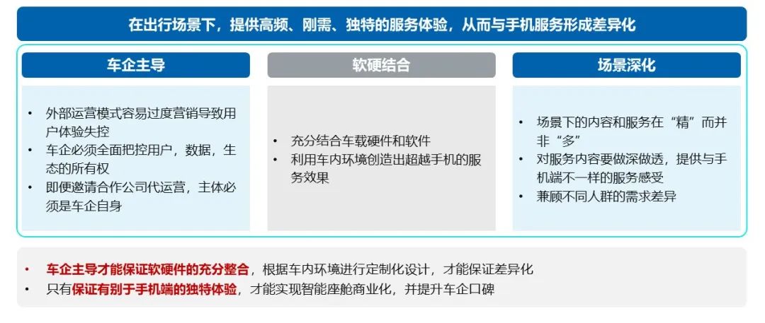 - 需要在车企的主导下通过软硬结合的方式对场景进行深入研究,挖掘不同人群的差异化需求,并为其提供个性化服务保证用户满意度。