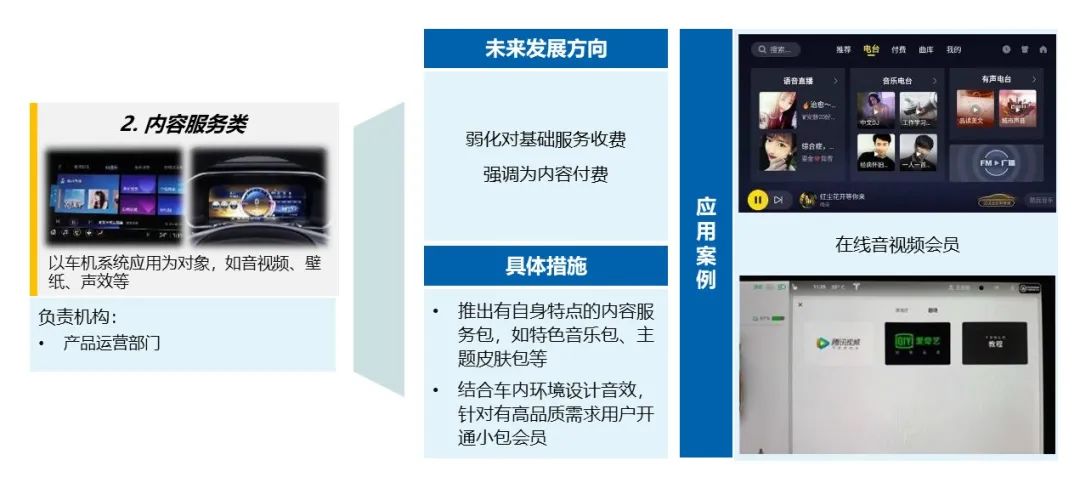- 现有的商业化内容有车辆功能、内容服务、养车服务、智能硬件、出行服务、在线商城共六大类型。但随着车辆智能化及用户个性化需求的不断发展,会有更多服务内容逐渐涌现出来。