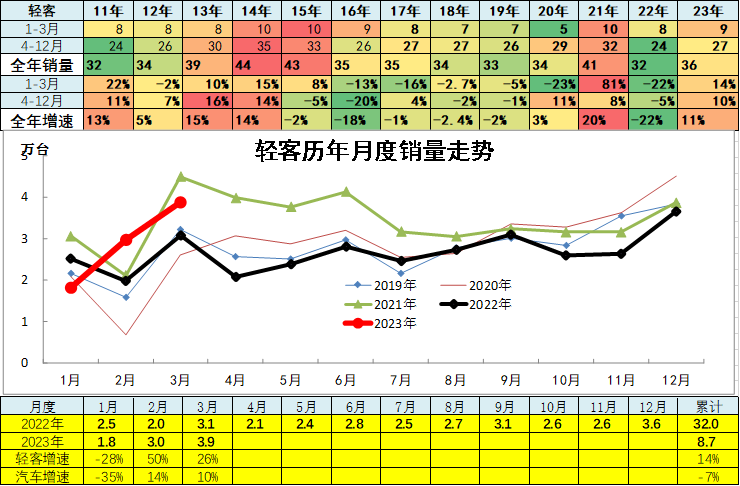 2023年累计轻客销量8.65万台,累计增速14%;3月销量3.87万台,同比增长26.1%,环比增长30.5%。