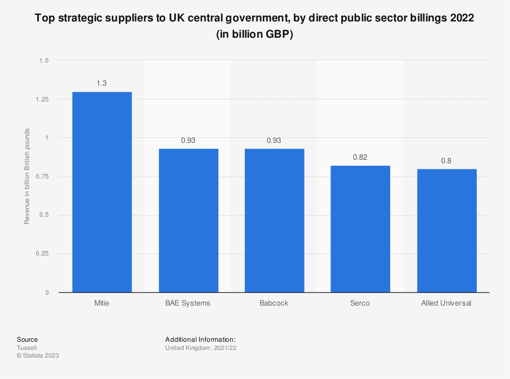 在英国,有几家不同的公司从政府获得了咨询和管理各种不同公共服务的合同。这些服务包括但不限于:国家卫生服务(National Health Service-NHS)的医院设施管理、移民遣返中心和寻求庇护者住房。授予这些公司的合同价值不菲,其中最赚钱的前两个合同分别价值近20亿英镑。此外,英国中央政府的顶级战略供应商的直接公共部门账单在10亿英磅左右。
