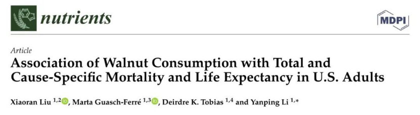 [2] Liu X, Guasch-Ferré M, Tobias DK, Li Y. Association of Walnut Consumption with Total and Cause-Specific Mortality and Life Expectancy in U.S. Adults. Nutrients. 2021;13(8):2699. Published 2021 Aug 4. doi:10.3390/nu13082699