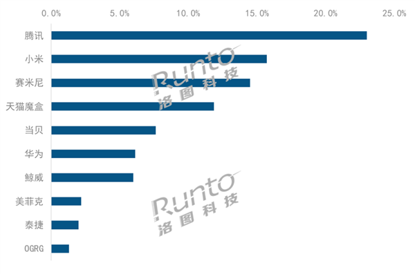 腾讯排在首位,市场份额为23%,较去年同期上涨6.7个百分点。腾讯3月推出新品极光盒子5代,首发价299元,主打卖点为8K影视资源。